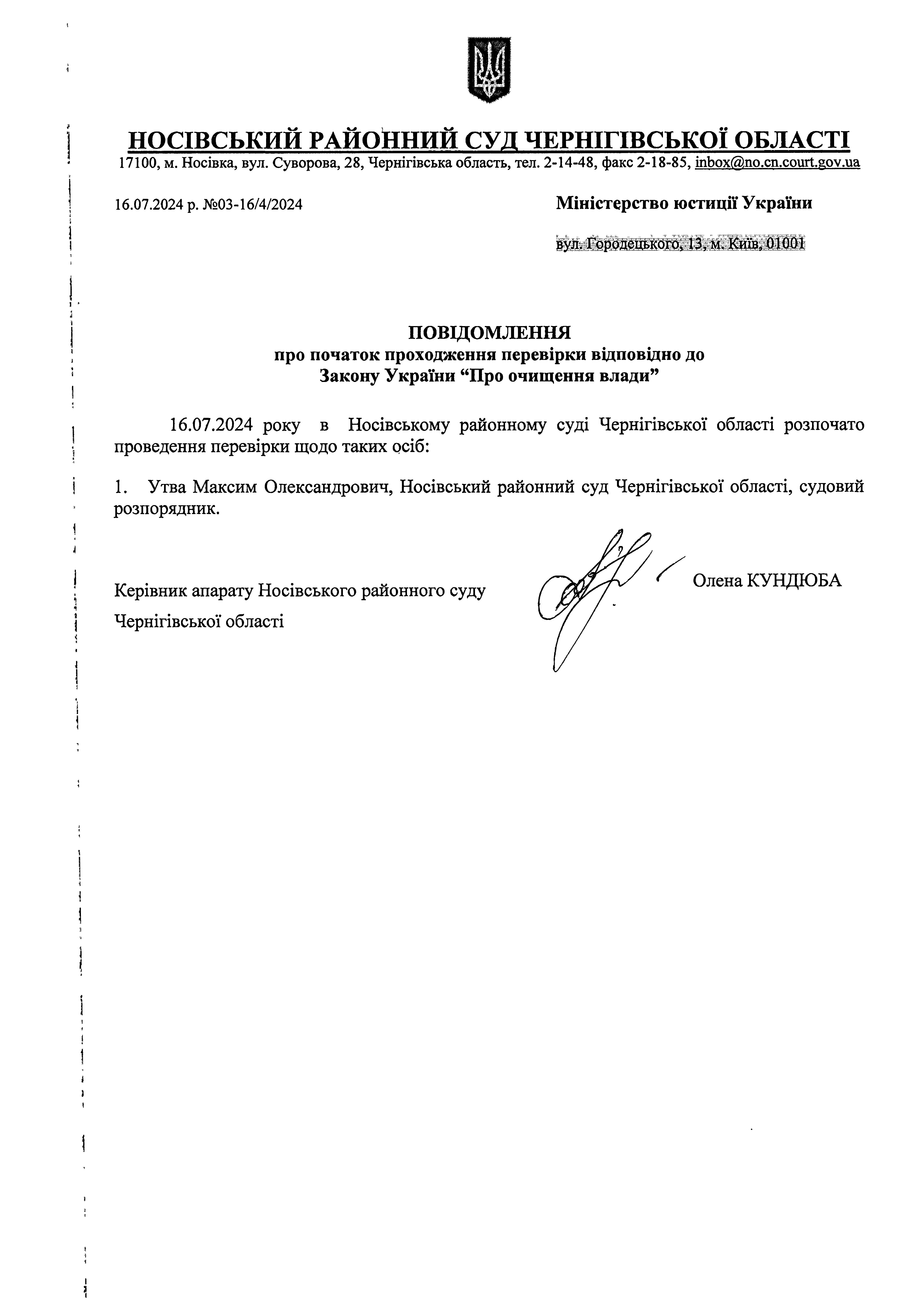 Повідомлення про початок проведення перевірки щодо державних службовців Носівського районного суду
